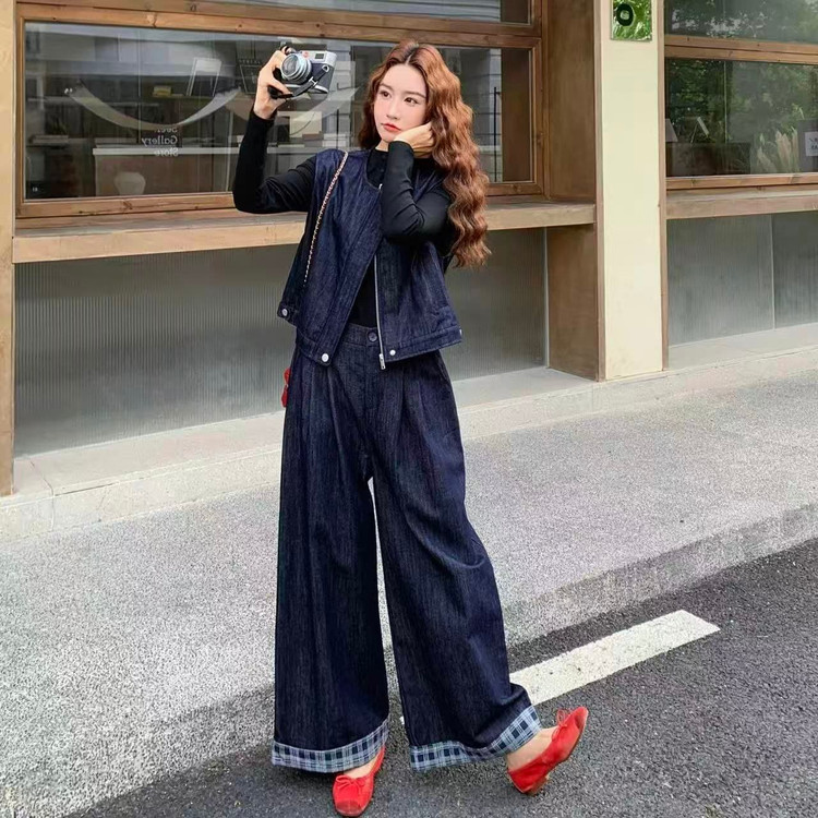ست دو تیکه جلیقه و شلوار جین زنانه زیپ دار وارداتی