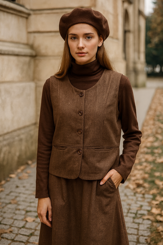 ست سه تیکه زنانه قهوه ای با دامن .مدل پاییزی مینیمال